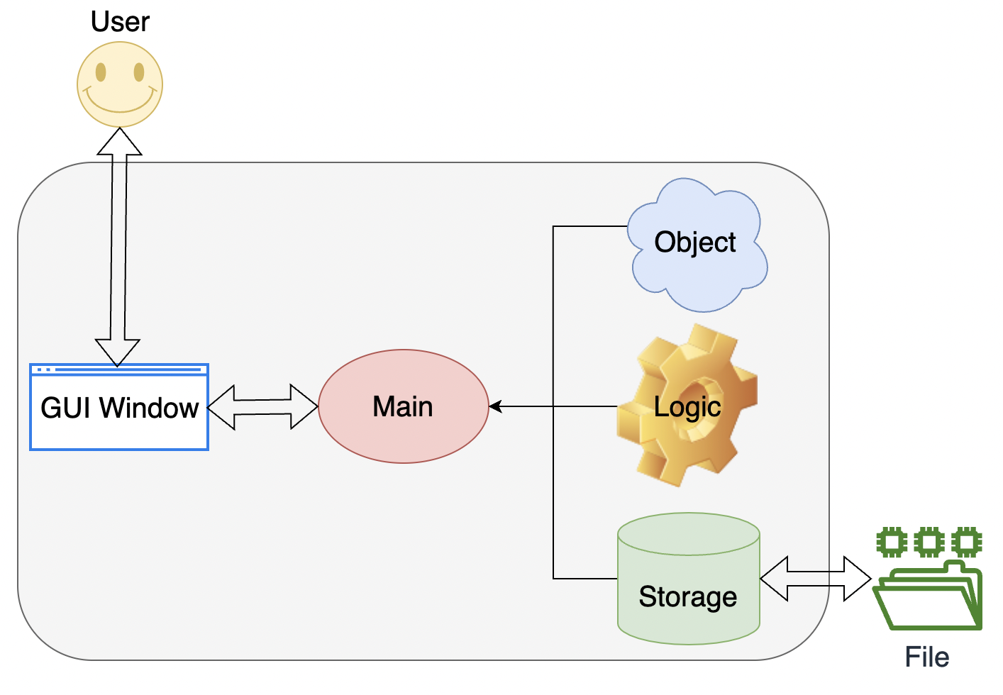 - UI component (UI, Input / Output, DialogBox, MainWindow, Main, Launcher)